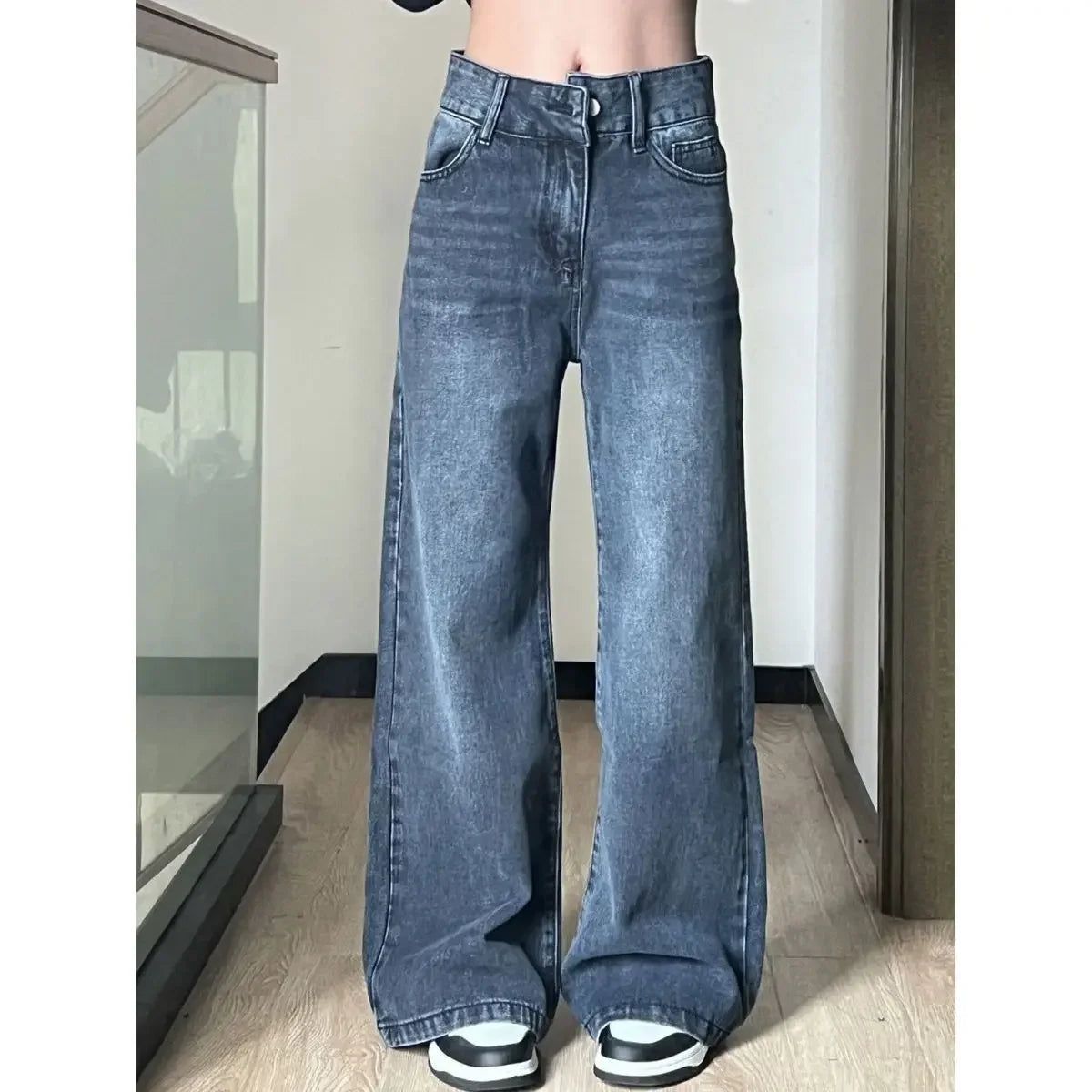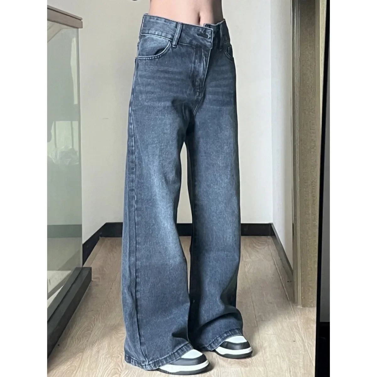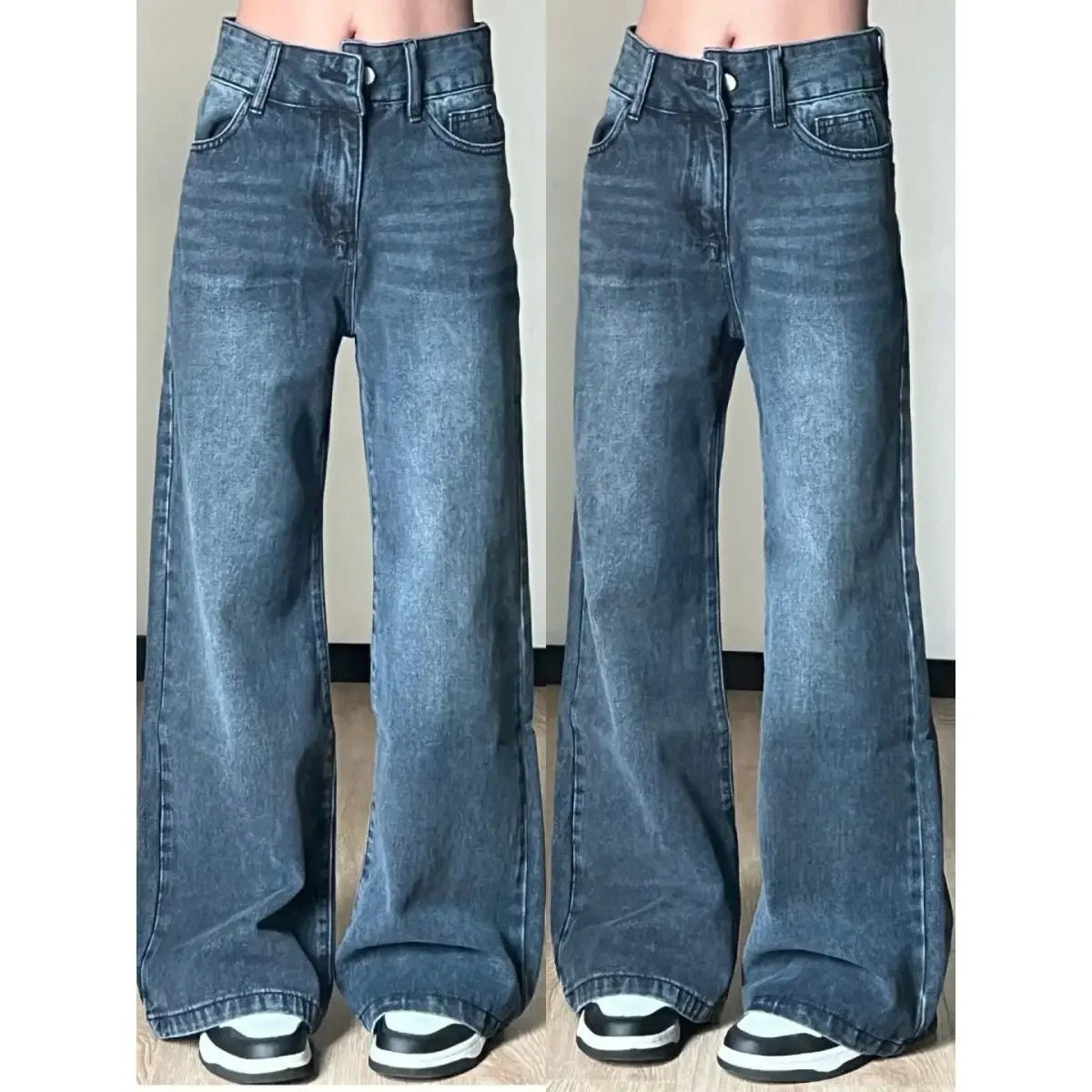 Jean large rétro bleu gris taille haute tendance