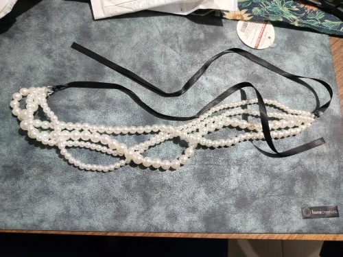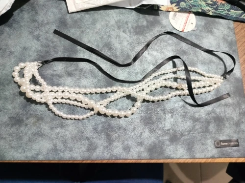 Le collier se distingue par ses perles blanches délicates, créant un look chic et raffiné. Le long ruban noir qui accompagne le collier ajoute une dimension supplémentaire à son design, permettant de le personnaliser selon vos envies. Que vous souhaitiez le nouer en un joli nœud ou le laisser pendre librement, ce bijou s'adapte à votre style.