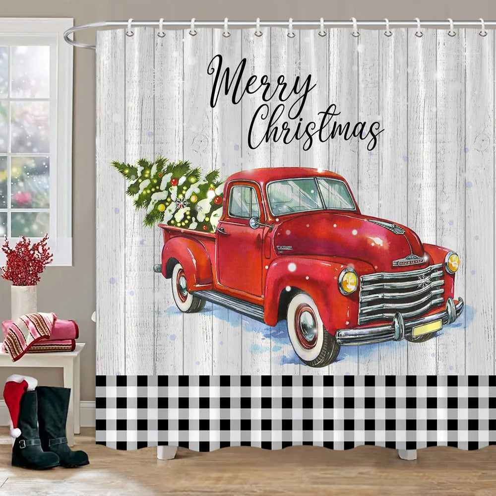 Rideau de Douche Hiver: Camion Rouge & Bonhomme de Neige
